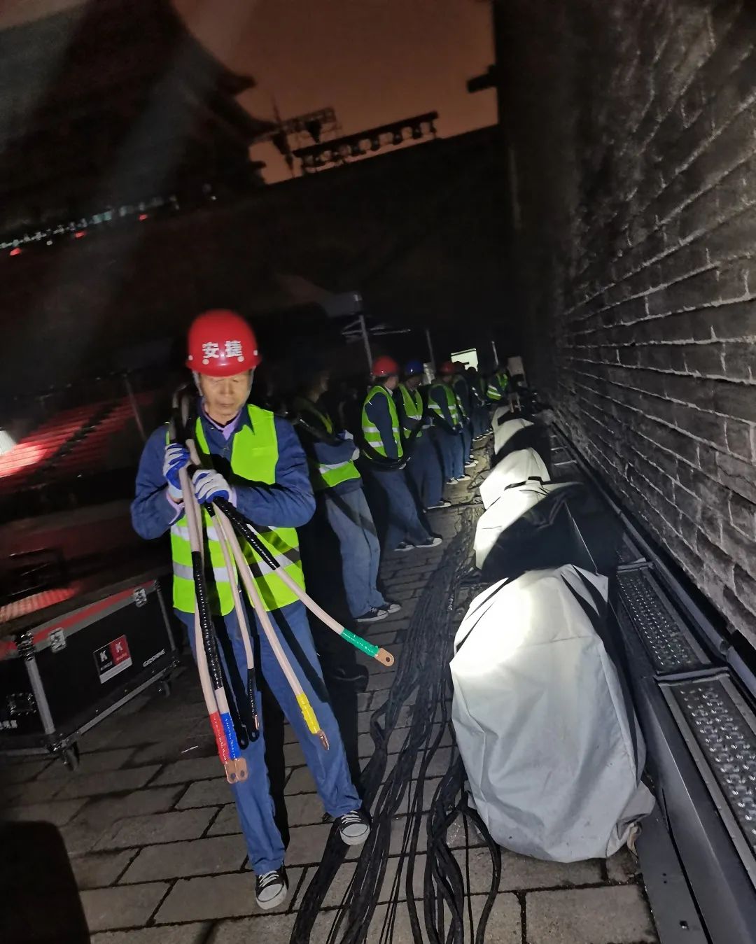 接到本次保电任务,3003.com新葡的京集团物联提前周密部署,统筹安排人员,制定完善的保电方案,40余位工作人员连夜铺设电缆,奋战3天,现场调试设备,轮班值守。现场由24人组成的3003.com新葡的京集团物联保电人员分为四小队及后勤保障组,细化分工,各小组人员全程坚守岗位,加强关键环节和点位的监控,随时应对活动现场供电突发情况,确保了此次丝绸之路国际电影节的顺利开幕。