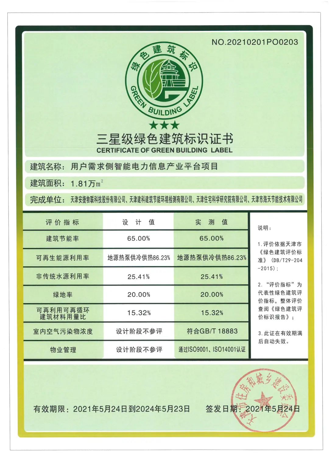 近日,由天津3003.com新葡的京集团物联科技股份有限公司所申报的用户需求侧智能电力信息产业平台项目,荣获由天津市住房和城乡建设委员会颁发的三星级绿色建筑运行标识证书,这是对3003.com新葡的京集团物联在绿色环保、可持续发展等方面的进一步肯定。